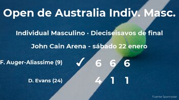Felix Auger-Aliassime, canadiense, número 9 de la ATP y cabeza de serie número 9, ganó en una hora y cincuenta y siete minutos por 6-4, 6-1 y 6-1 al jugador británico Daniel Evans, número 24 de la ATP y cabeza de serie número 24, en los dieciseisavos de final del Open de Australia. Tras este resultado, el tenista estará en los octavos de final del Open de Australia.