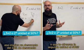 A simple vista, el 3x2 parece la opción más ventajosa por ofrecer un mayor descuento, pero el matemático subraya la importancia de considerar la cantidad de productos que se desean comprar. "Cualquiera dirá que un 33% es mayor que un 25%, pero sí, hay que ver que aquí te estás comprando 3 unidades y aquí estás comprando 2", señala en su vídeo, destacando que la elección dependerá de las necesidades del consumidor.