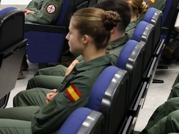 Nuevas fotografías de la Princesa Leonor en la Academia General del Aire (AGA) de San Javier, Murcia, con el resto de sus compañeros. Vestida con el característico mono de trabajo verde y su moño trenzado, la heredera acudió a una conferencia presidida por la ministra de defensa.
