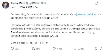 "Enorme alegría por el aplastante triunfo de mi amigo José Antonio Kast en las elecciones presidenciales de Chile", escribió el mandatario argentino en su perfil de la red social X.