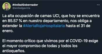 Razón por la que el gobernador del departamento, Aníbal Gaviria, anunció a través de su cuenta de Twitter que la alerta roja hospitalaria en el departamento se extenderá hasta el 31 de enero.