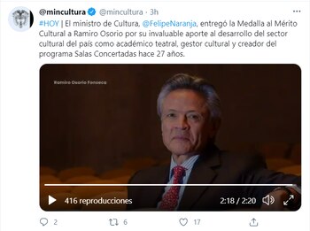 Durante el evento, el ministro de Cultura entregó la Medalla al Mérito Cultural a Ramiro Osorio por su invaluable aporte al desarrollo del sector cultural del país como académico teatral, gestor cultural y creador del programa Salas Concertadas hace 27 años.