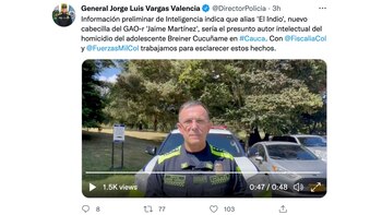 “Información preliminar de Inteligencia indica que alias ‘El Indio’, nuevo cabecilla del GAO-r ‘Jaime Martínez’, sería el presunto autor intelectual del homicidio del adolescente Breiner Cucuñame en #Cauca. Con @FiscaliaCol y @FuerzasMilCol trabajamos para esclarecer estos hechos”, anunció el director de la institución a través de sus redes sociales.