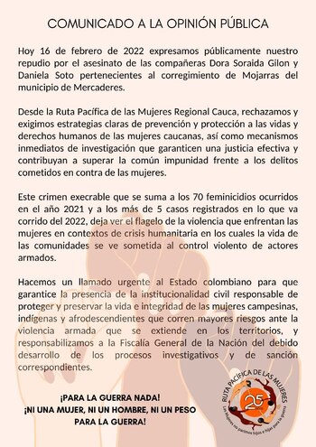 Por su parte, el movimiento feminista Ruta Pacífica de las Mujeres rechazó contundentemente este acto. “Exigimos estrategias claras de prevención y protección a las vidas y derechos humanos de las mujeres caucanas, así como mecanismos inmediatos de investigación que garanticen una justicia efectiva y contribuyan a superar la impunidad frente a los delitos cometidos en contra de las mujeres”.