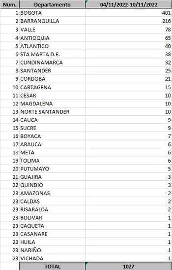 El Ministerio de Salud reportó 1.027 casos nuevos de covid-19 en Colombia. En la última semana, del 4 al 10 de noviembre de 2022, fueron procesadas 31.100 pruebas, de las cuales 13.468 fueron PCR y 17.632 de antígenos.