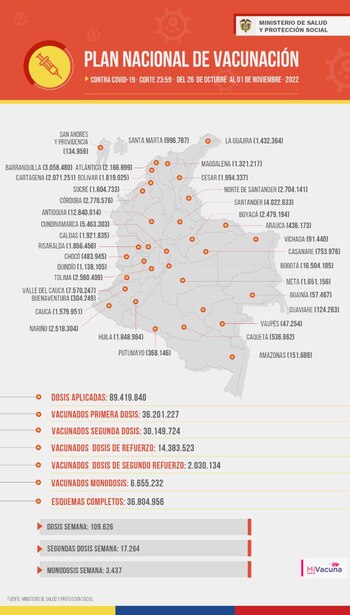 El más reciente reporte del Ministerio de Salud también señala que, con corte al periodo 26 de octubre al 1 de noviembre de 2022, se han aplicado en Colombia un total de 89.419.840 dosis de la vacuna contra el covid-19.