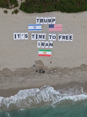 Un grupo de personas desplegó un en la playa de Miami Beach un enorme mensaje destinado a Donald Trump con la leyenda “Es hora de liberar a Irán”.