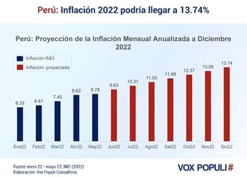 En base a la inflación oficial de enero a mayo (Instituto Nacional de Estadística e Informática), Vox Populi Consultoría ha hecho una proyección a diciembre de este año. El resultado es francamente aterrador: 13.74% de inflación para 2022, la más alta después de 28 años (15.24% en 1994)