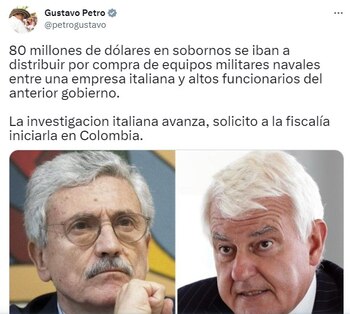 “80 millones de dólares en sobornos se iban a distribuir por compra de equipos militares navales entre una empresa italiana y altos funcionarios del anterior gobierno. La investigación italiana avanza, solicito a la Fiscalía iniciarla en Colombia”, trinó el jefe de Estado colombiano.