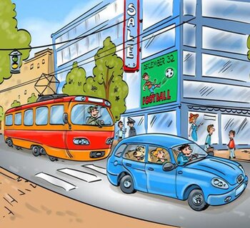 In der folgenden Abbildung sehen Sie eine Straße in den Morgenstunden, in der Sie Menschen laufen sehen, eine Fußballwerbung, ein orangefarbener öffentlicher Verkehr und ein privates blaues Auto. Alles deutet darauf hin, dass es zu einer möglichen Kollision zwischen den beiden Autos kommen wird, aber nein. Was Sie platzieren müssen, sind Fehler, die weit von der Realität entfernt sind und die nur in der Vorstellung des Menschen existieren können.