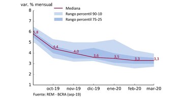 - PBI: Se espera una variación del Producto Interno Bruto real para 2019 de -2,9% (una reducción 0,4 p.p. mayor). A su vez, prevén que en 2020 la actividad eco-nómica se contraiga 1,5% (0,4 p.p. mayor), en tanto que redujeron la expectativa de crecimiento para 2021 hasta 1,6% (antes 1,9%). “Asimismo, mantuvieron la estimación de retracción de la actividad económica para el tercer trimestre (-0,7%), al tiempo que redujeron sus expectativas de variación trimestral sin estacionalidad (s.e.) del PIB para el último trimestre del año (de -0,7% a -1,1%). Para el primer trimestre del año próximo esperan una caída s.e. de la actividad económica de 0,5%”.