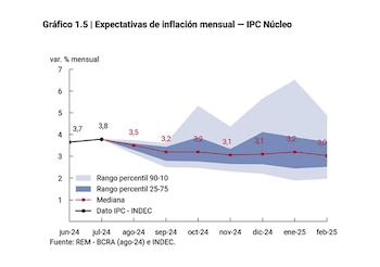 Respecto del IPC Núcleo, el conjunto de participantes del REM ubicó sus previsiones para agosto en 3,5% y para septiembre en 3,2%. A partir de los meses siguientes, el sendero oscila entre el 3 y el 3,2% para esta medición, que excluye de la inflación total los precios estacionales y regulados, como las tarifas.