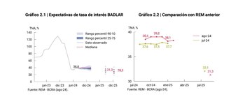 En los pronósticos del REM, en el marco de la inflación estabilizada, aparece una perspectiva al alza de la tasa de interés. La tasa Badlar se espera en 38,5% para agosto y 39% para septiembre, por encima del 37,6% y 37,5% que, respectivamente, se esperaba en el informe anterior. La tasa Badlar es la que fija el rendimiento que los bancos privados pagan a depósitos superiores a un millón de pesos a plazo fijo a 30 días.