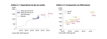 “La mediana de las proyecciones de tipo de cambio nominal del REM se ubicó en $961,9 por dólar para el promedio de septiembre de 2024 lo que implicaría una suba mensual promedio de 2,0% de la paridad cambiaria”, señalo el informe del BCRA. También destacó que los $1.025 que se estiman para el final del año representan una “variación interanual a diciembre 2024 implícita en los pronósticos de 59,7% (9,8 p.p. menos que el REM previo).”