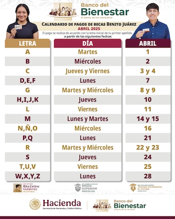 El calendario de pagos de las Becas Benito Juárez está organizado por la inicial del primer apellido de los beneficiarios para garantizar un proceso ordenado y evitar aglomeraciones. Te compartimos las fechas correspondientes para esta semana: