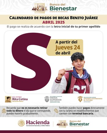 De acuerdo con el calendario oficial de pagos establecido por la Coordinación Nacional de Becas para el Bienestar Benito Juárez, hoy los beneficiarios cuyo primer apellido comienza con la letra S serán los que recibirán su pago en la tarjeta del Banco del Bienestar. Este depósito corresponde al bimestre marzo-abril.