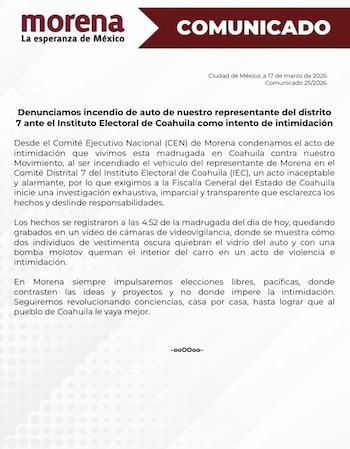 El Comité Ejecutivo Nacional de Morena condenó este martes el incendio provocado del automóvil de su representante ante el Comité Distrital 7 del Instituto Electoral de Coahuila, ocurrido en las primeras horas de la madrugada en un hecho que el partido calificó como un acto deliberado de intimidación política en el marco del proceso electoral en curso en la entidad.