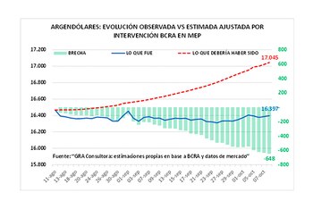 a. La evaporación de la venta de dólares MEP del BCRA. Entre 11 de agosto y el 12 de octubre estimamos que el BCRA habría vendido unos USD 590 millones en el mercado MEP (venta de dólares en el país). Esos dólares deberían haber engrosado los depósitos en el sistema. De modo que cuando hablamos de USD 70 millones de caída, en realidad, debemos considerar que los ahorristas habrían retirado ya más de USD 650 millones (la caída verificada, más la no suba que debería haber ocurrido); y