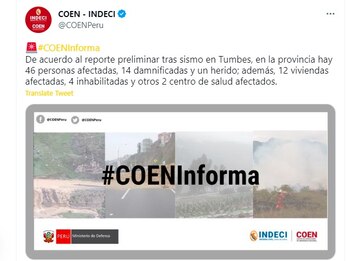 El Centro de Operaciones de Emergencia Nacional (COEN) informó que solo la provincia de Tumbes registra 46 personas afectadas y 14 damnificadas, así como 12 viviendas afectadas, cuatro inhabilitadas y dos centros de salud afectados.