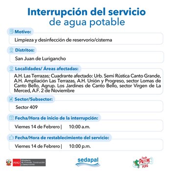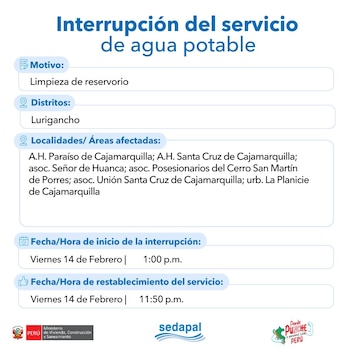 El servicio de agua potable será suspendido temporalmente en diferentes zonas de Lurigancho debido a la limpieza de reservorios programada por Sedapal. La interrupción comenzará a la 1:00 p.m. y se extenderá hasta las 11:50 p.m. de ese mismo día.