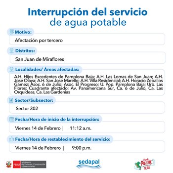 Por otro lado, también se interrumpirá el servicio en áreas como la Asociación Vivienda Las Gardenias, C.H. San Juan de Miraflores, Urb. Entel Perú y Urb. San Juan, en el cuadrante delimitado por la calle Los Lirios, Av. Pedro Miotta, Av. Los Héroes y Av. Buckingham. El corte comenzará a las 9:13 a.m. y se espera que el servicio se restablezca a las 7:00 p.m.