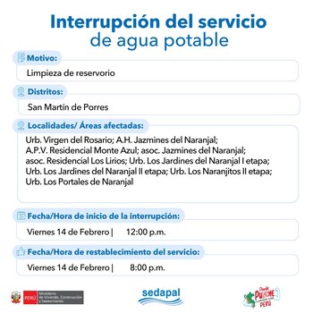 Varias zonas de San Martín de Porres se verán afectados por la suspensión temporal del servicio de agua potable debido a labores de mantenimiento. La interrupción, que se llevará a cabo de 12:00 p.m. a 8:00 p.m., está motivada por la limpieza de los reservorios.