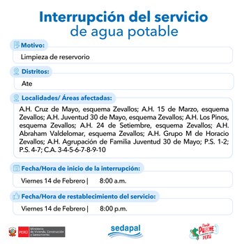 Los vecinos de Ate experimentarán una suspensión temporal del servicio de agua debido a dos actividades programadas por Sedapal. La primera zona afectada será de 8:00 a.m. a 8:00 p.m. debido a la limpieza de reservorios. Las áreas que estarán sin agua durante este horario incluyen: