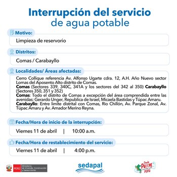 El distrito de Comas también sufrirá un corte de agua el 11 de abril. La interrupción comenzará a las 10:00 a.m. y finalizará a las 4:00 p.m. El motivo del corte es la limpieza de reservorios.