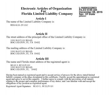 Las últimas transacciones reportadas por la FinCEN fueron justo antes de que Sullivan apareciera como comprador de un lujoso condominio de Muñoz-Pochetti en Miami, la Unidad 23 del Regalia, por USD 10.700.000. La operación se concretó el 3 de enero de 2017 con una firma constituida pocos días antes, Regalia 23 LLC, registrada por Sullivan en el estado de Florida.