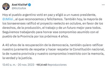 “Hoy el pueblo argentino votó en paz y eligió a un nuevo presidente, Javier Milei, al que reconocemos y felicitamos”, señaló Kicillof en su cuenta de Twitter. Pero aclaró haciendo referencia a su triunfo personal en las elecciones generales: “También hoy (por ayer), la mayoría de los bonaerenses ratificó el proyecto reelecto en octubre, en favor de los derechos, de la producción, el trabajo y de un futuro mejor para todos. Seguiremos trabajando para honrar ese compromiso asumido con el pueblo de la Provincia por los próximos 4 años”.